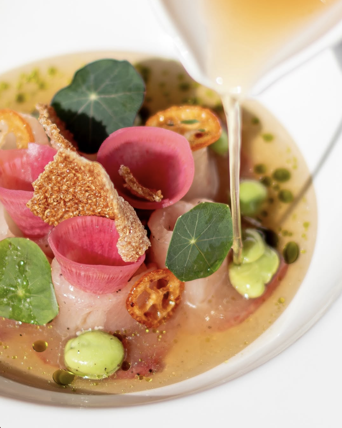 Thinly sliced yellowtail carpaccio with purple cabbage and dill dressing